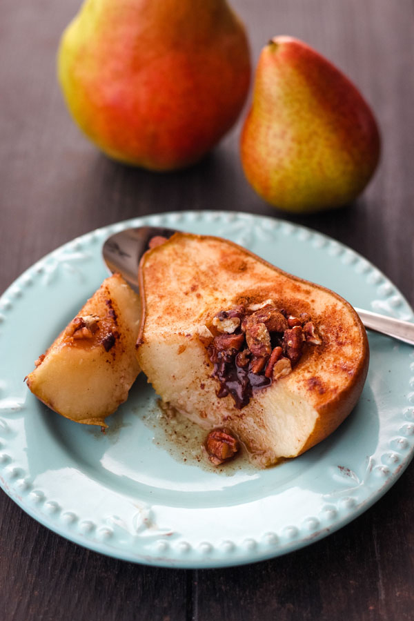 These sweet baked pears are surprisingly simple to make. All you need is a ripe pear, cinnamon, nuts, and a drizzle of maple syrup!
