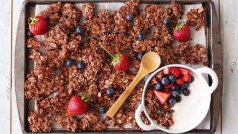 A grown-up version of your favorite chocolate cereal, this clumpy granola is great for snacking or crumbling into parfaits. Package it in a mason jar with a bow for a fun gift.