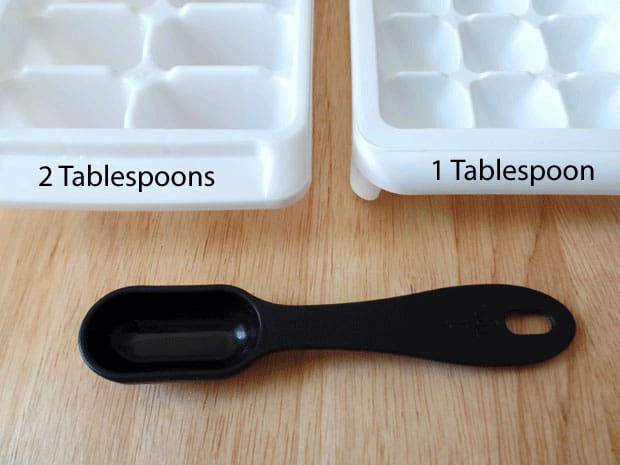 We have two sets of ice cube trays. One that holds 1 tablespoon of liquid and one that holds 2 tablespoons.