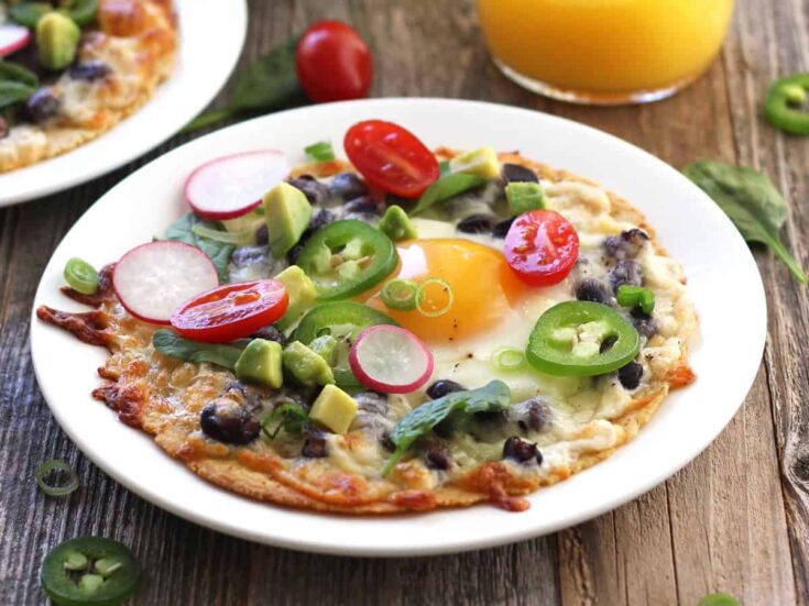 These breakfast tostadas feature a corn tortilla topped with black beans, cheese, and an egg that’s cooked to your liking.